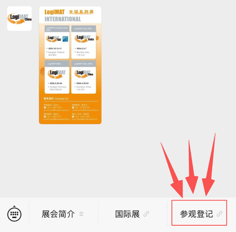 长按下方图片识别二维码,关注展会官方公众号:LogiMAT内部物流展(ID:logimat-china),点击菜单栏【参观登记】,即可进入预登记页面。