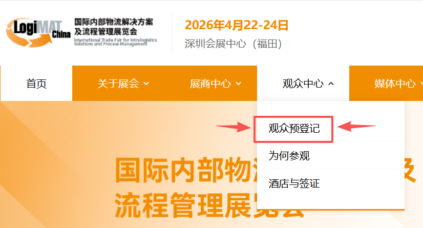 打开展会官网(www.logimat.cn),点击菜单栏【观众中心】→【观众预登记】,或直接点击首页【参观登记】进行注册。